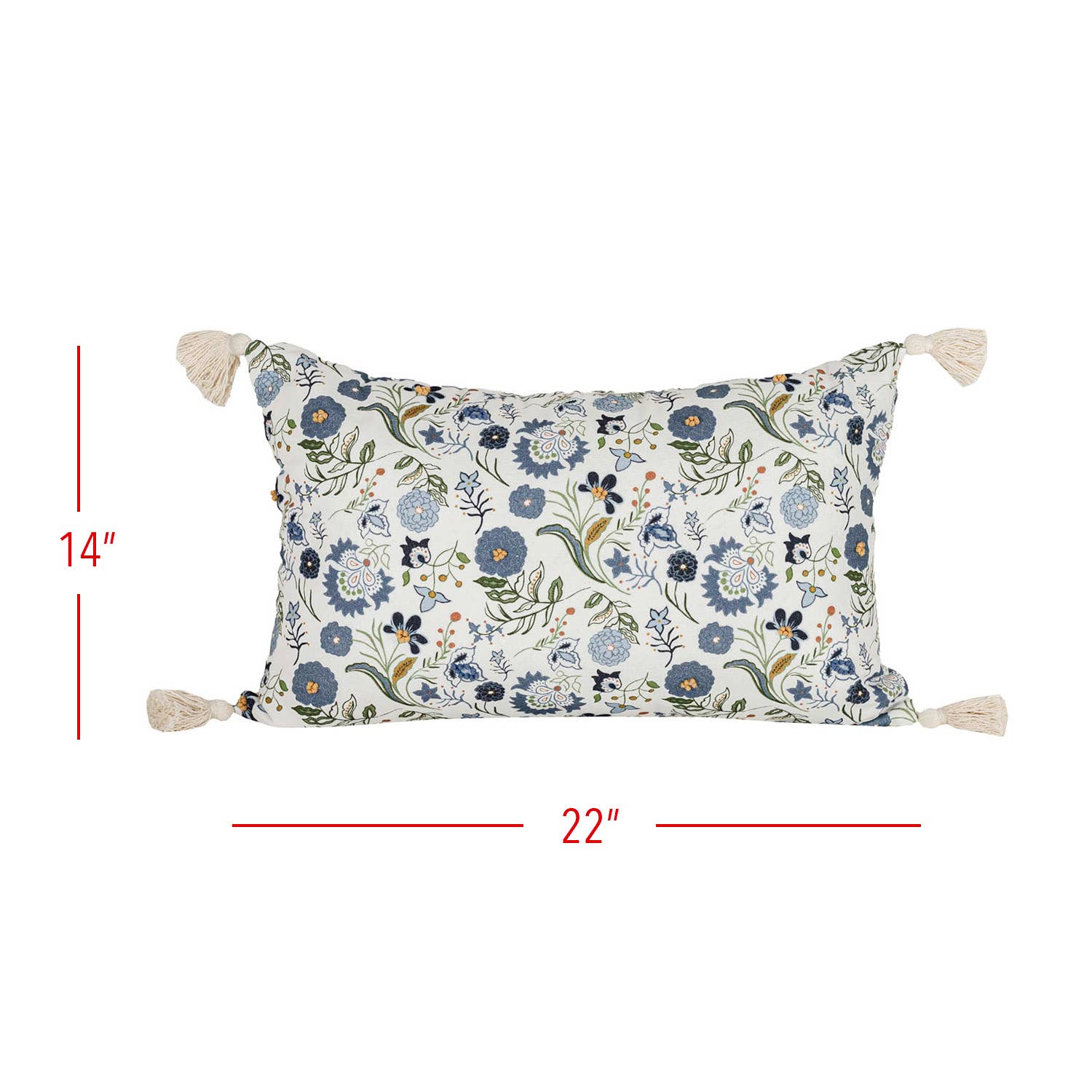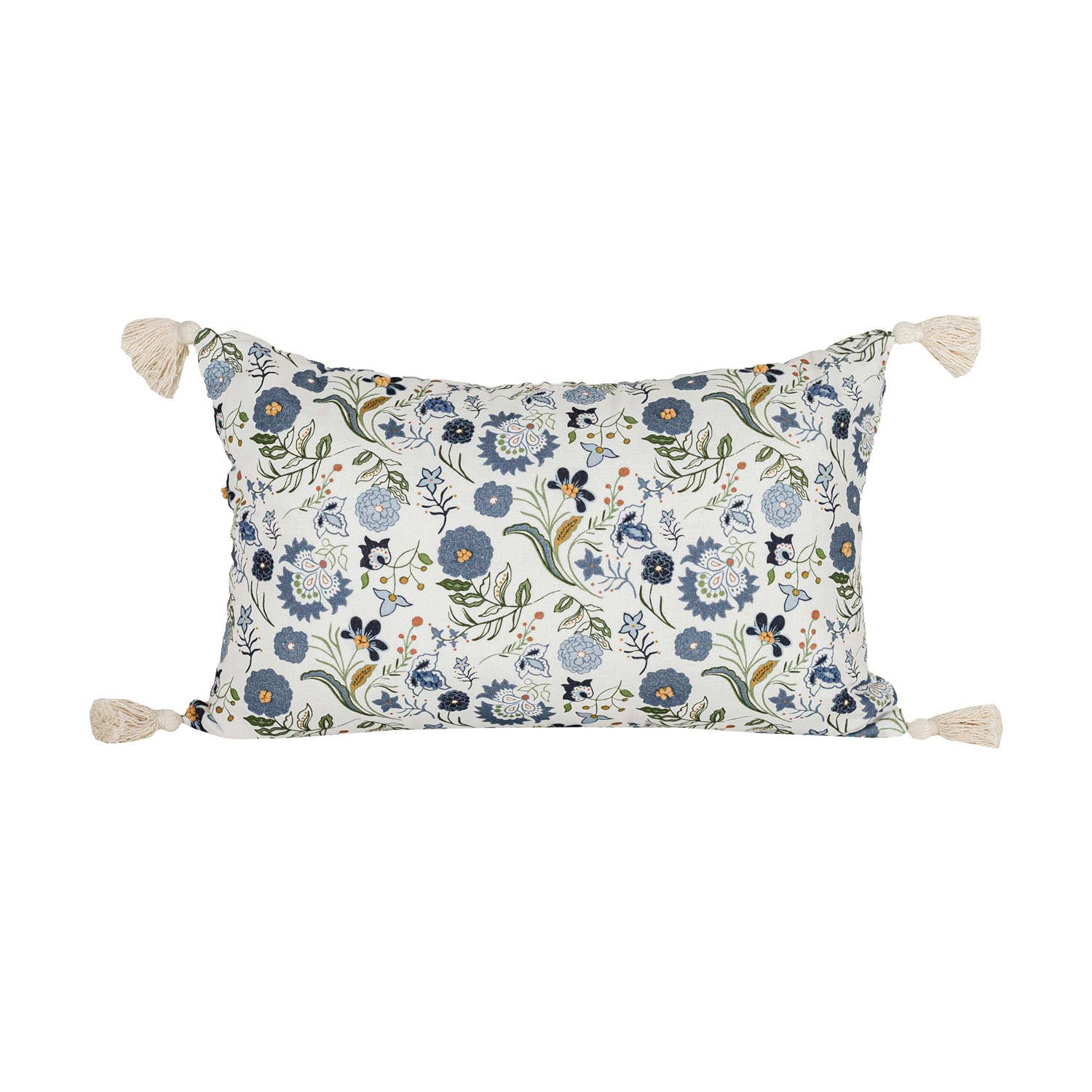 The striking Marguerite pillow features intricate floral patterns in a classic Suzani style. Fresh blue tones are highlighted by delicate embroidery for added texture. Finished with cotton tassels. -Lumbar size for accenting with other pillows or for use as stand-alone statement. -Spot Clean Only.