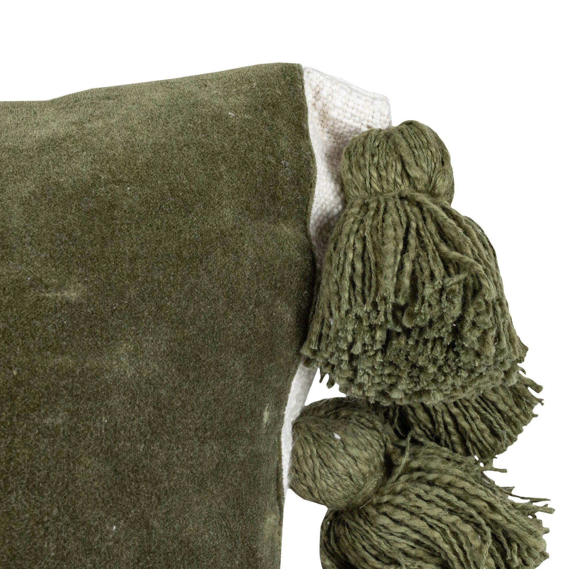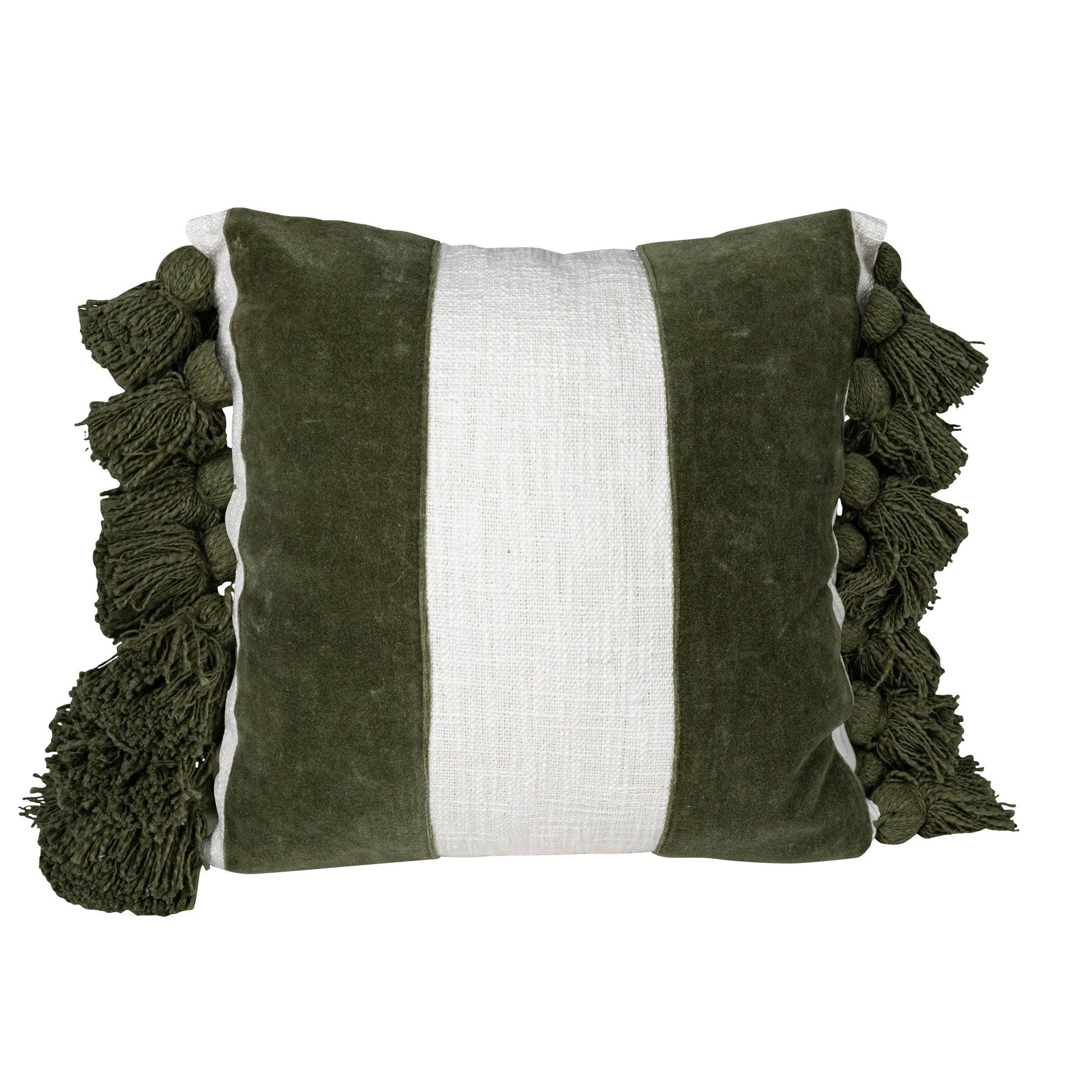 This beautiful decorative pillow is a sophisticated, vibrant pillow with its rich green stripes. Layered on top of a soft, slub cotton base are bold velvet stripes lined with oversized green tassels. All those details make this a functional yet fashionable addition to your pillow assortment. Hand-woven by artisans in India.