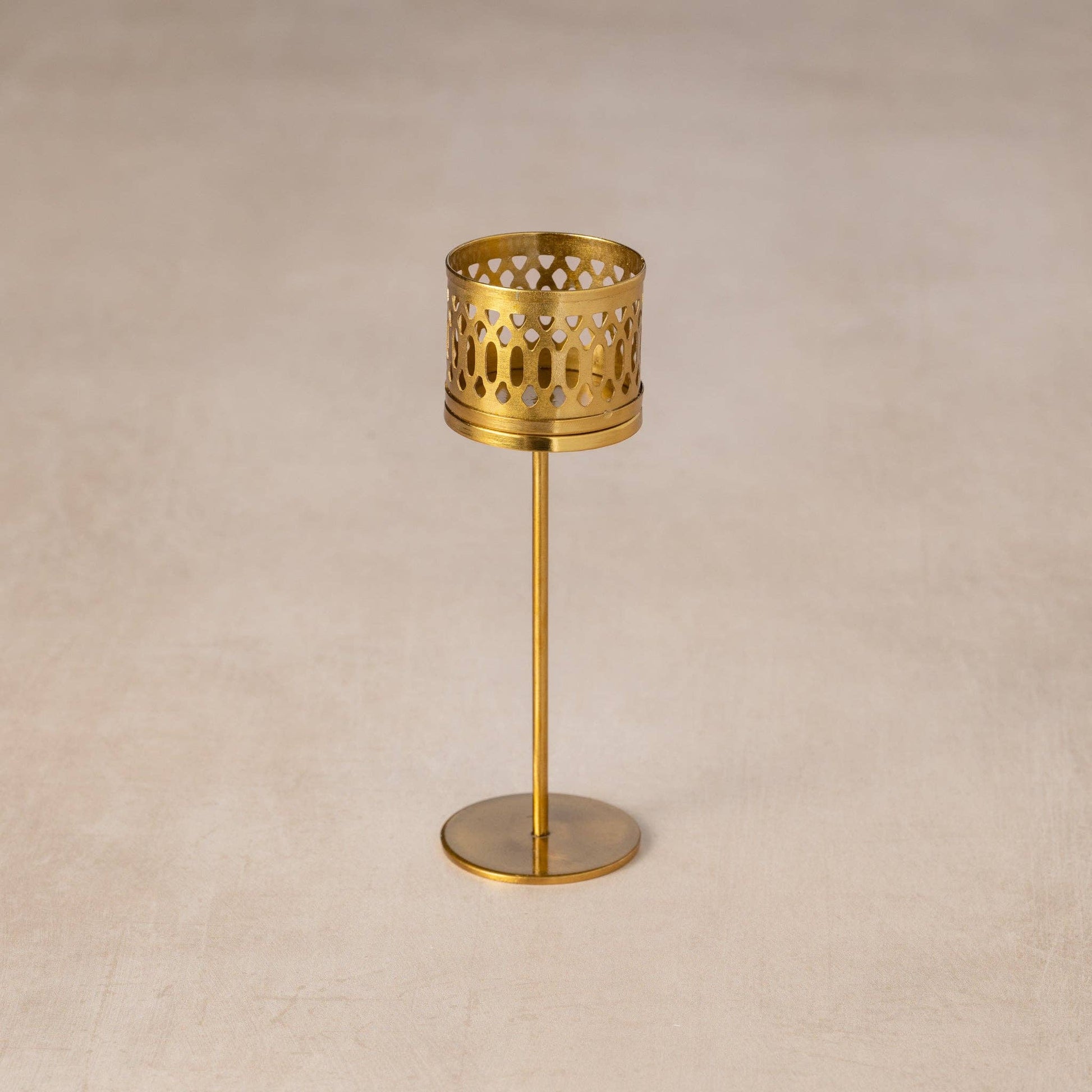 Add a warm, ambient glow to any room with this versatile candleholder! The tealight holder is a cylinder that features a gorgeous lattice cutout design. For a taller presentation, twist the threaded rod of the base into the bottom of the cylinder. Simply remove the rod for a low profile. Two beautiful looks in one! Made of durable iron with a brushed brass plated finish.