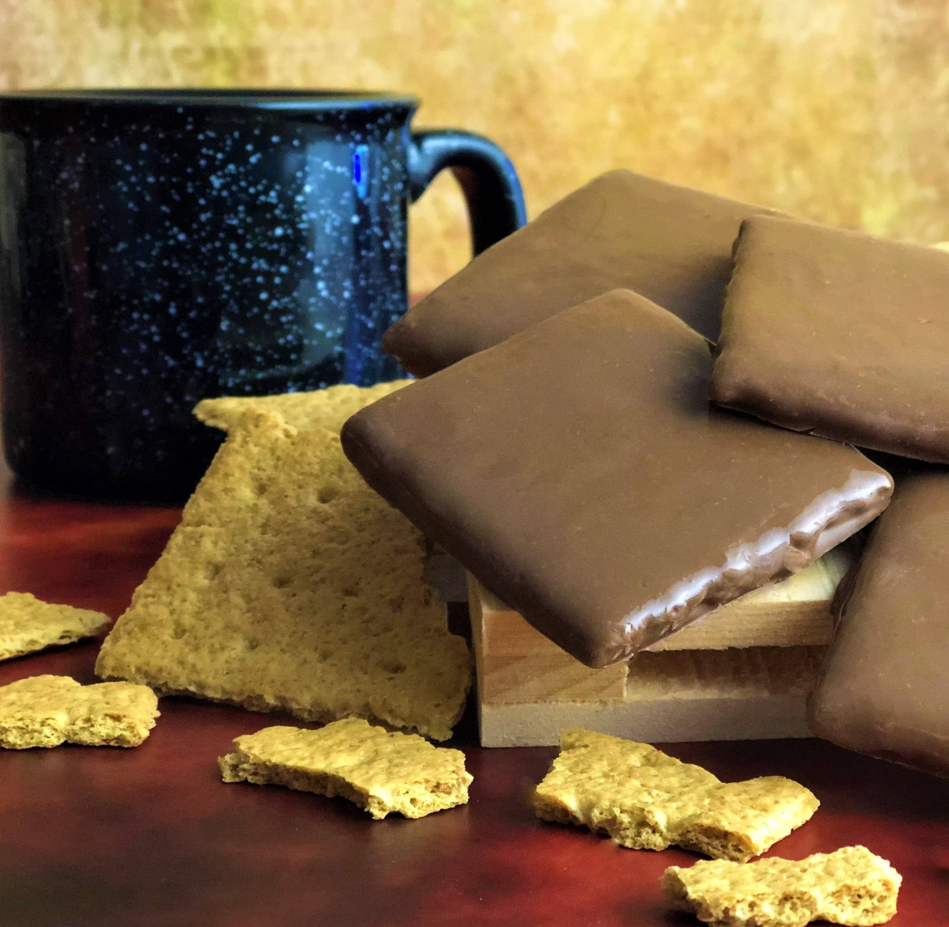Simple but delicious. A classic snack elevated with gourmet milk chocolate. We cover crisp, golden graham crackers in our rich milk chocolate and seal 4 per package in clear cello. Perfect grab and go item for cash-wraps.
