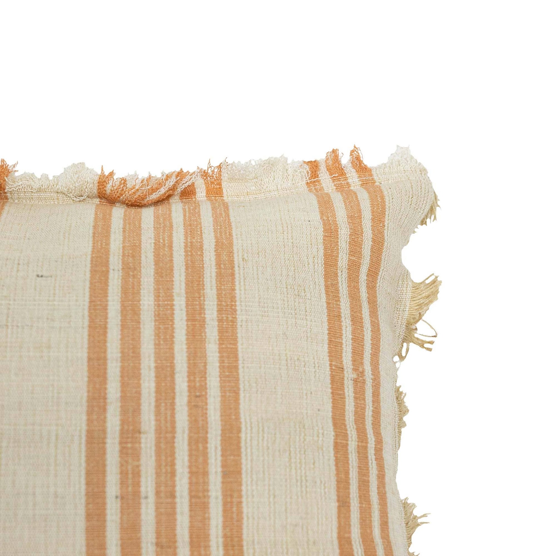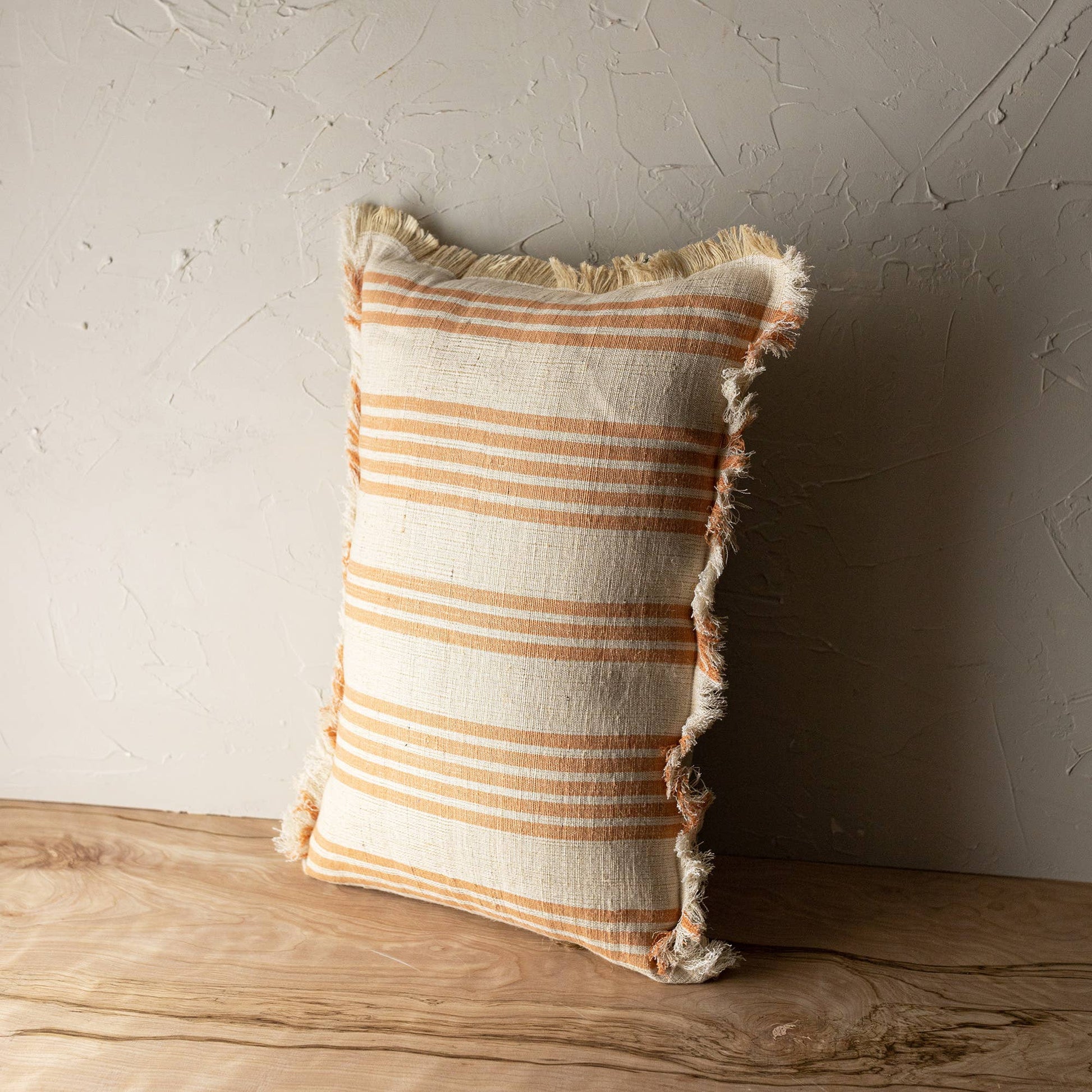 With the combination of cozy cotton and natural jute, this lumbar throw pillow will add texture and warmth to your traditional decor. Earthy coral stripes are woven into an unbleached cotton and jute base. The stripes extend into the textural fringe that accents all edges for a full and luxurious aesthetic. Pair with warm tones of summer decor or cozy casual fall decor when layered with harvest textiles.