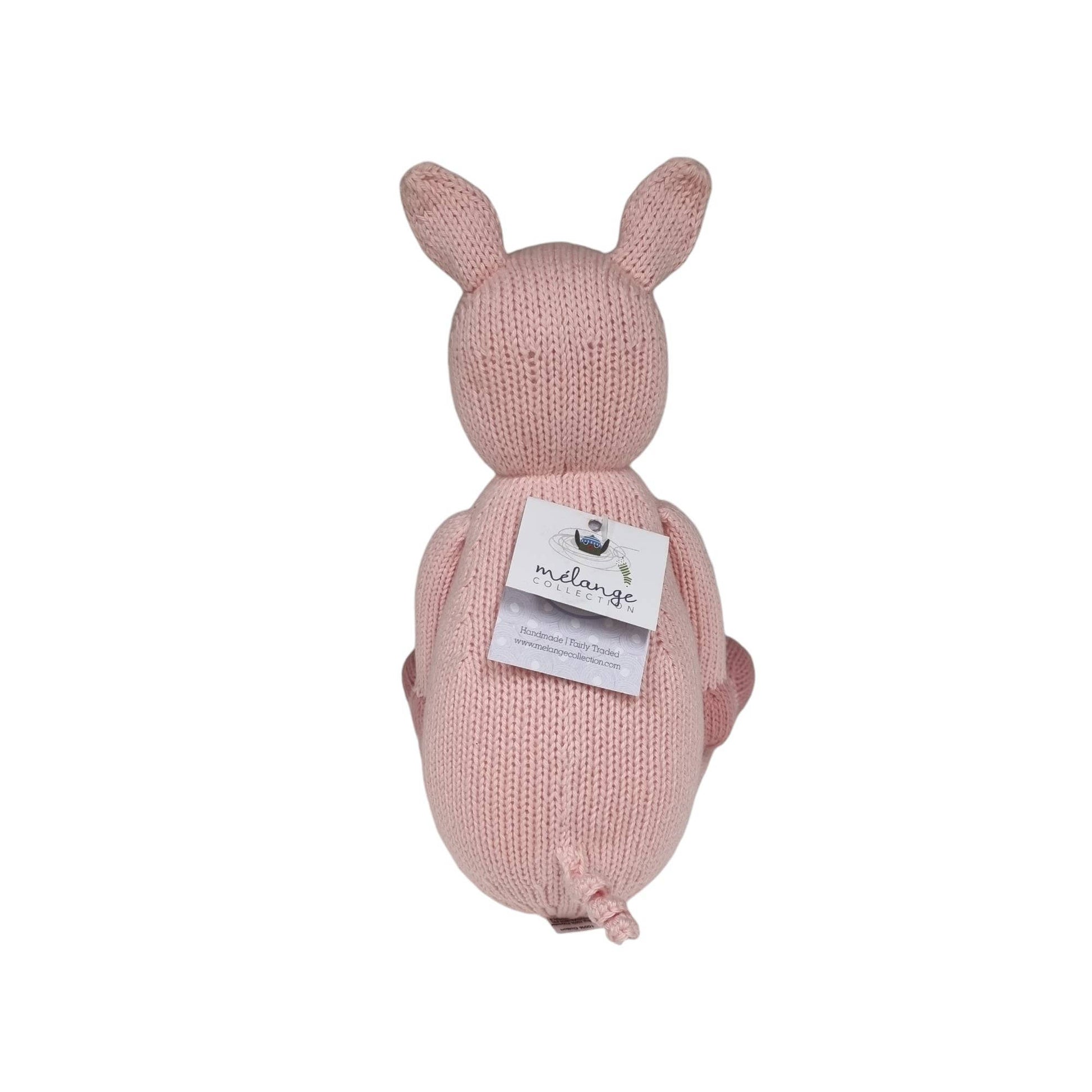 This charming piglet is crafted from soft, cotton yarn in a sweet pastel pink color, making it both comforting and durable. With its cute ears, rounded snout, and gentle stitched eyes, this knit pig has a whimsical, timeless look that will delight children and collectors alike.