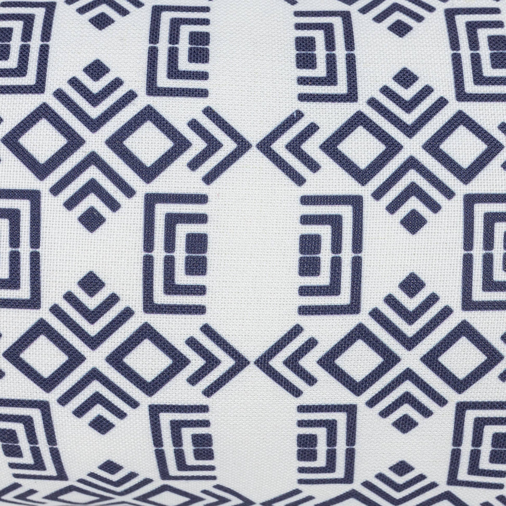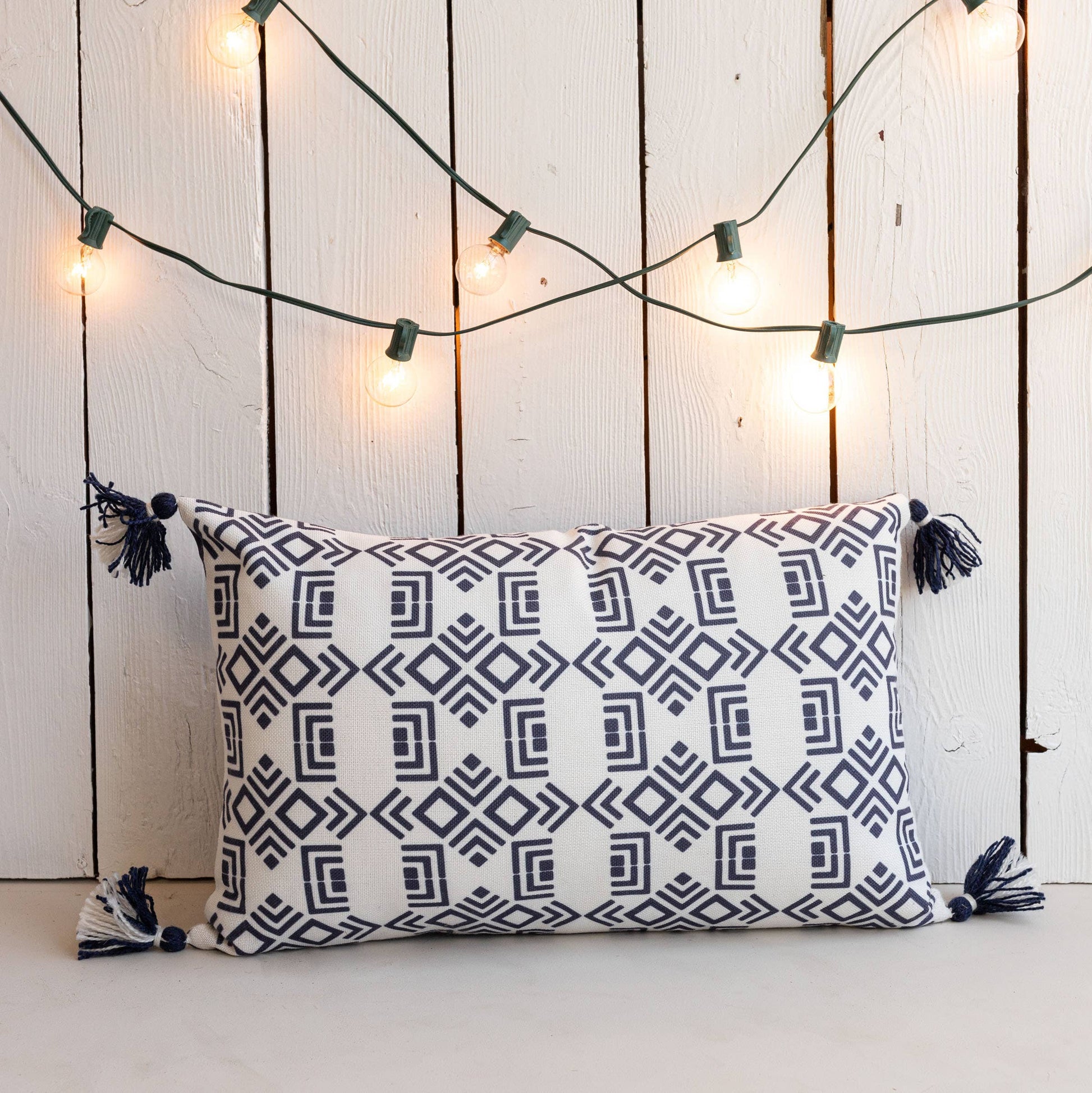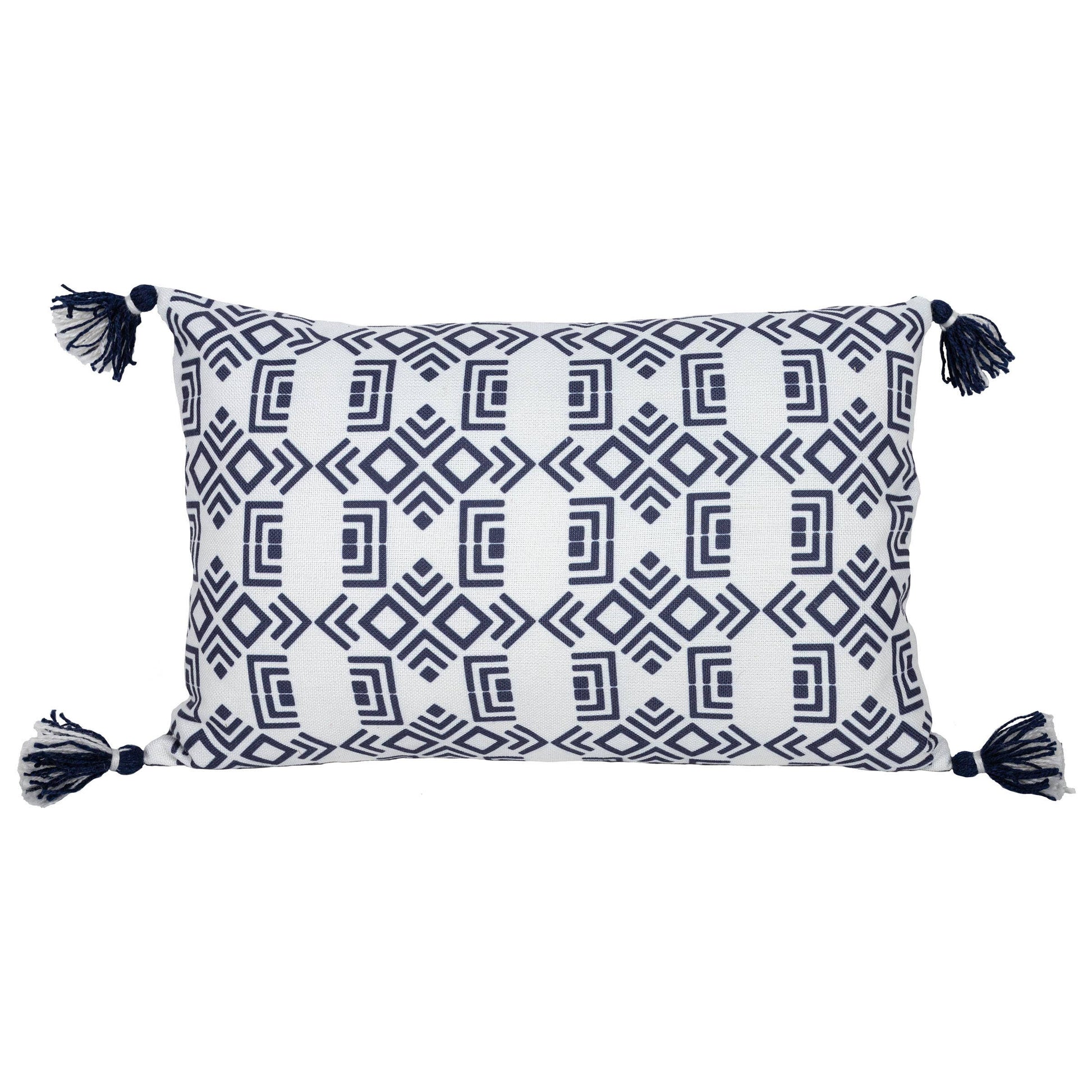 An intricate navy-blue geometric pattern is printed on a clean white base finished with blue and white combination tassels in each corner, tied together by a navy-blue backing. Paired with the classic blue and white coloration, the Southwest inspired design adds a bit of boho flair to your outdoor space.