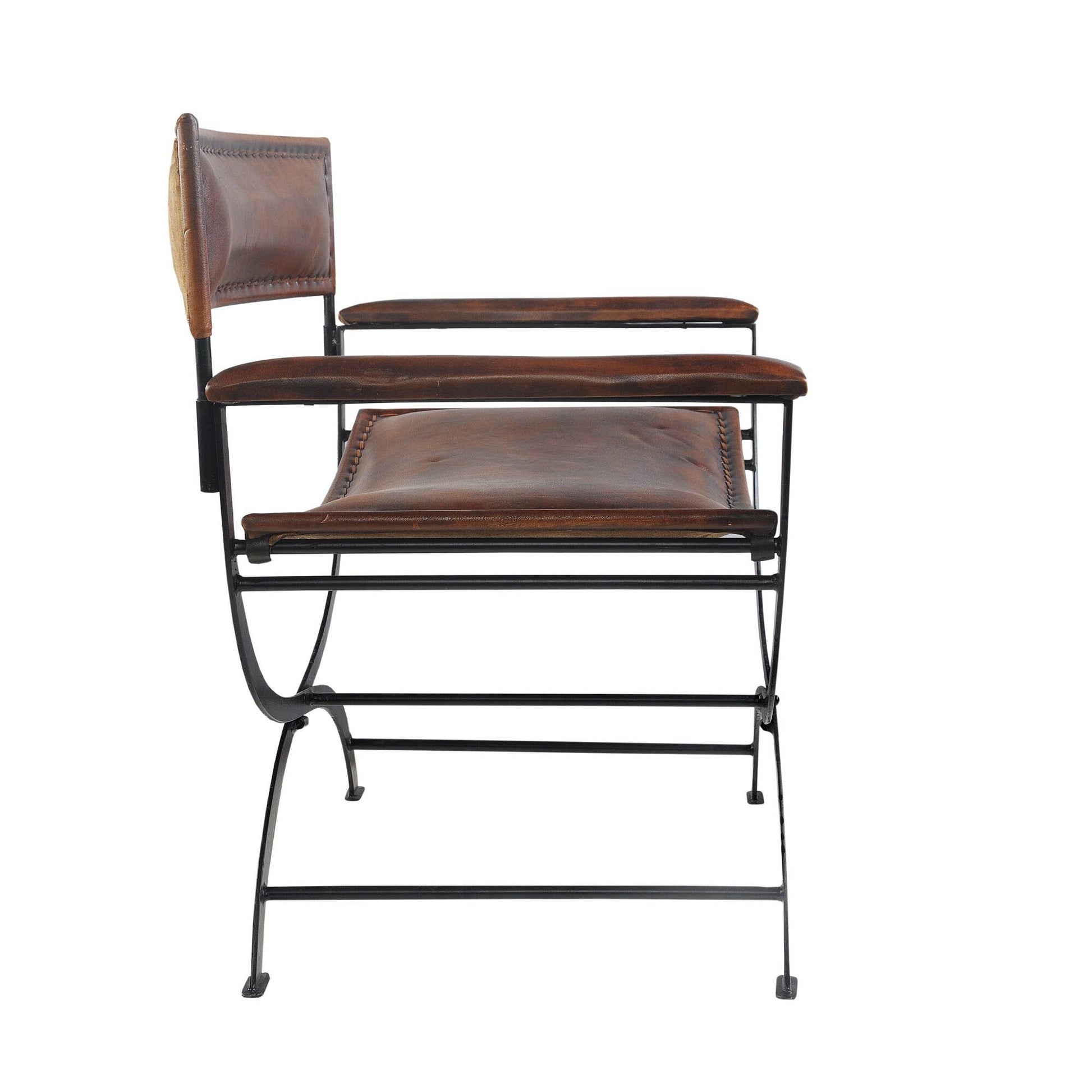 Introducing our Brown Leather Director Accent Chair, blending modern style with functional seating. Handmade in India, it's a perfect addition to offices, reading rooms, or living spaces seeking that missing accent. The welcoming leather seat with comfortable armrests ensures relaxation for any occasion. Ideal for tying décor together, it includes iron legs and a leather chair cover. Some assembly is required, with hardware included for convenience. Base made from 100% Iron, top from 95% Leather and 5% Canvas, it exudes durability and style.