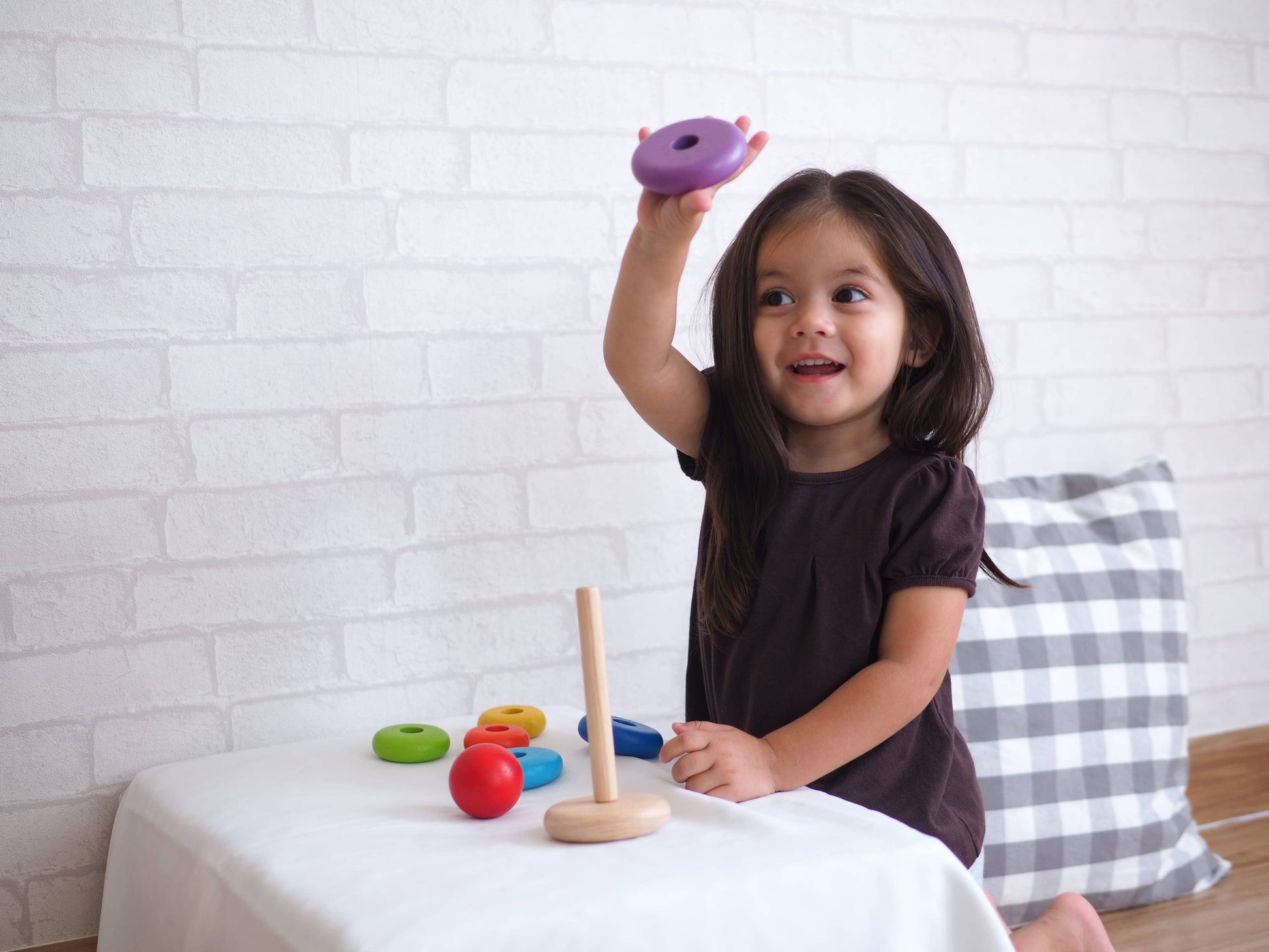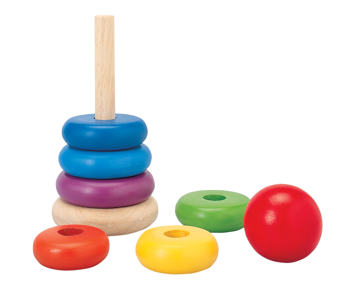 The colorful wooden ring set helps teach children about size and colors. For safety precaution, the center rod is foldable.