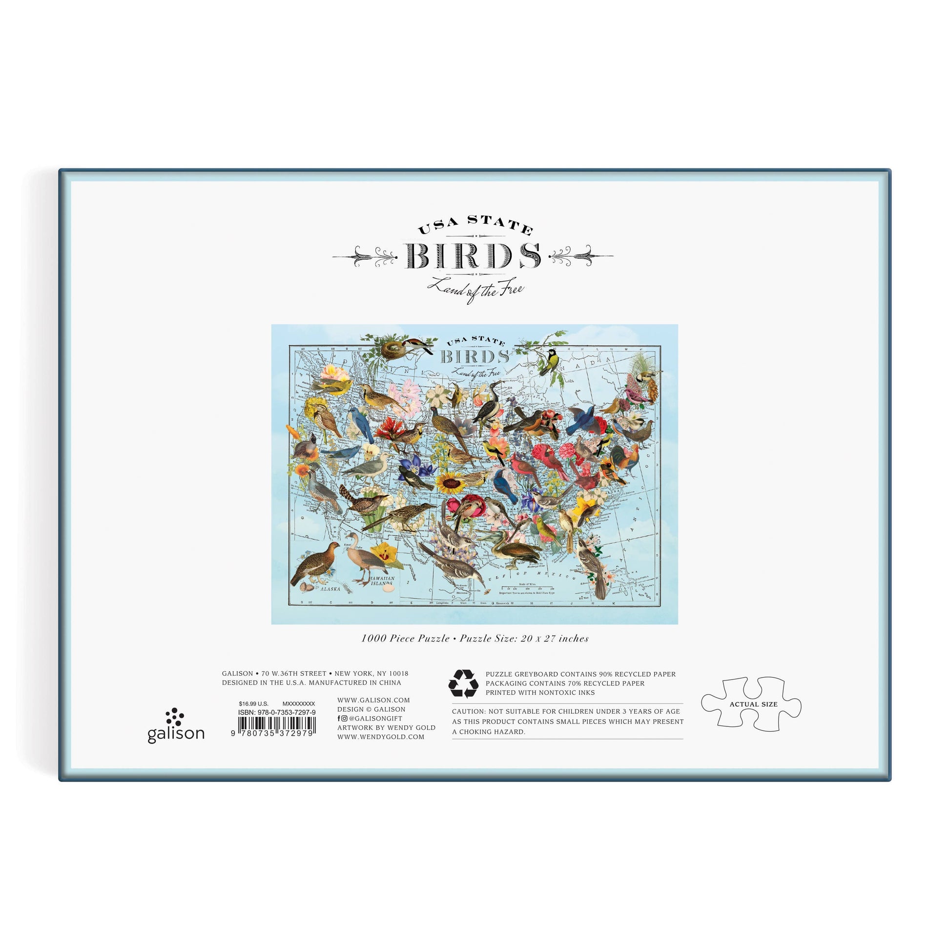 Galison's State Birds 1000 Piece Puzzle from Wendy Gold features vintage images of birds and flowers collaged and gathered over a map of the United States. Wendy Gold's stunning collage artwork makes for a challenging and gorgeous puzzle that your family will love piecing together. Galison puzzles are packaged in matte-finish sturdy boxes, perfect for gifting, reuse, and storage.